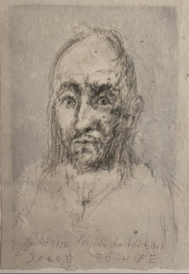 Veit-Johannes Stratmann, "Nicht Ich, der ich der Ich bin, Jakob Böhme, Graphit auf Himalayapaier, ca. 17 x 13 cm, 2022